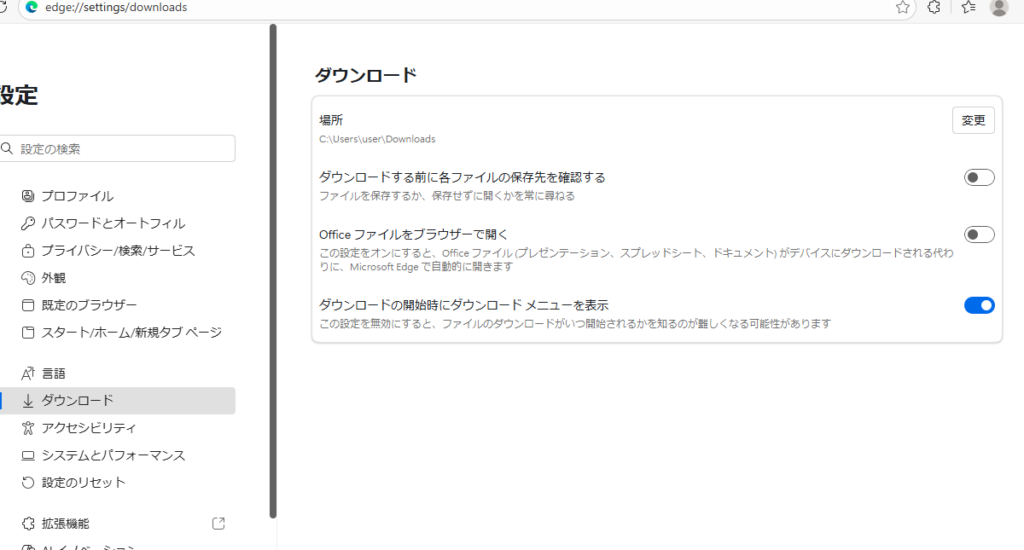 ※「Office ファイルをブラウザーで開く」がONになっていると、ダウンロードされず直接ブラウザ内でファイルが開かれます。